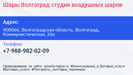 Шары-Волгоград, студия воздушных шаров по адресу 400066, Волгоградская область, Волгоград, Коммунистическая, 26а в дальнейшем Организация, размещена в следующих категориях: