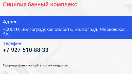 Сицилия, банный комплекс по адресу 400010, Волгоградская область, Волгоград, Московская, 4д в дальнейшем Организация, размещена в следующих категориях: