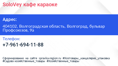 SoloVey, кафе-караоке по адресу 404102, Волгоградская область, Волгоград, бульвар Профсоюзов, 9а в дальнейшем Организация, размещена в следующих категориях: