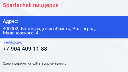 Spartacheli, пиццерия по адресу 400002, Волгоградская область, Волгоград, Малиновского, 4 в дальнейшем Организация, размещена в следующих категориях: