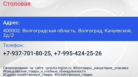 Столовая по адресу 400002, Волгоградская область, Волгоград, Качуевской, 2д/2 в дальнейшем Организация, размещена в следующих категориях: