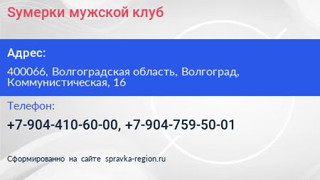 Sумерки, мужской клуб по адресу 400066, Волгоградская область, Волгоград, Коммунистическая, 16 в дальнейшем Организация, размещена в следующих категориях: