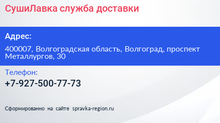 СушиЛавка, служба доставки по адресу 400007, Волгоградская область, Волгоград, проспект Металлургов, 30 в дальнейшем Организация, размещена в следующих категориях: