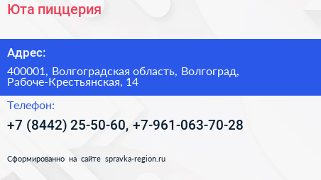 Юта, пиццерия по адресу 400001, Волгоградская область, Волгоград, Рабоче-Крестьянская, 14 в дальнейшем Организация, размещена в следующих категориях:
