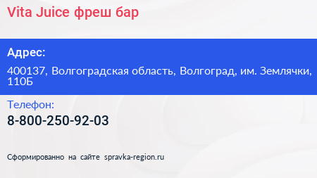 Vita Juice, фреш-бар по адресу 400137, Волгоградская область, Волгоград, им. Землячки, 110Б в дальнейшем Организация, размещена в следующих категориях: