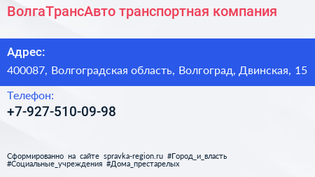 ВолгаТрансАвто, транспортная компания по адресу 400087, Волгоградская область, Волгоград, Двинская, 15 в дальнейшем Организация, размещена в следующих категориях: