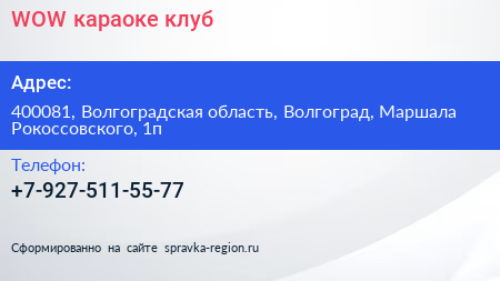 WOW, караоке-клуб по адресу 400081, Волгоградская область, Волгоград, Маршала Рокоссовского, 1п в дальнейшем Организация, размещена в следующих категориях: