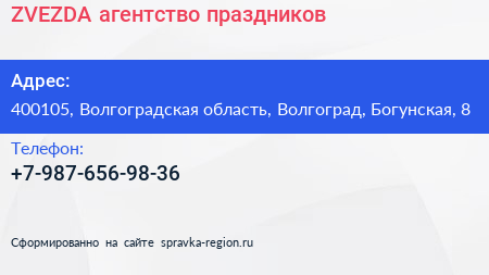 ZVEZDA, агентство праздников по адресу 400105, Волгоградская область, Волгоград, Богунская, 8 в дальнейшем Организация, размещена в следующих категориях: