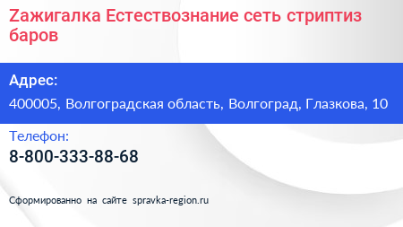 Zажигалка & Естествознание, сеть стриптиз-баров по адресу 400005, Волгоградская область, Волгоград, Глазкова, 10 в дальнейшем Организация, размещена в следующих категориях: