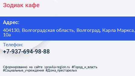 Зодиак, кафе по адресу 404130, Волгоградская область, Волгоград, Карла Маркса, 10а в дальнейшем Организация, размещена в следующих категориях: