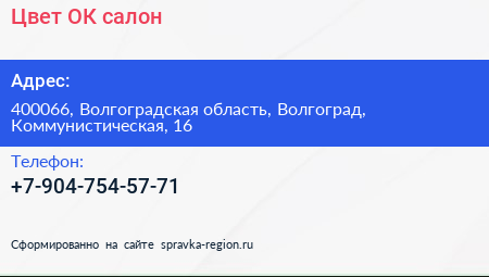 Цвет`ОК, салон по адресу 400066, Волгоградская область, Волгоград, Коммунистическая, 16 в дальнейшем Организация, размещена в следующих категориях: