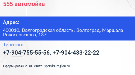 555, автомойка по адресу 400010, Волгоградская область, Волгоград, Маршала Рокоссовского, 137 в дальнейшем Организация, размещена в следующих категориях: