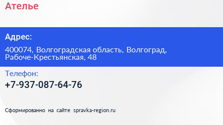 Ателье по адресу 400074, Волгоградская область, Волгоград, Рабоче-Крестьянская, 48 в дальнейшем Организация, размещена в следующих категориях:
