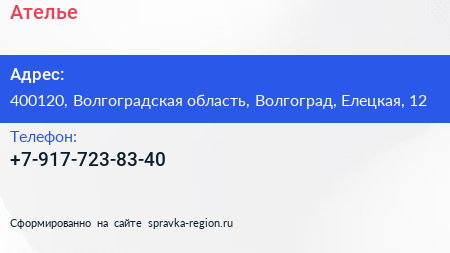 Ателье по адресу 400120, Волгоградская область, Волгоград, Елецкая, 12 в дальнейшем Организация, размещена в следующих категориях: