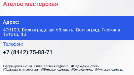 Ателье-мастерская по адресу 400123, Волгоградская область, Волгоград, Германа Титова, 13 в дальнейшем Организация, размещена в следующих категориях: