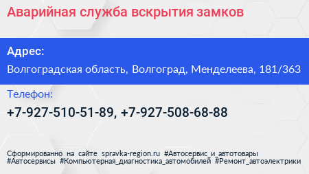 Аварийная служба вскрытия замков по адресу Волгоградская область, Волгоград, Менделеева, 181/363 в дальнейшем Организация, размещена в следующих категориях: