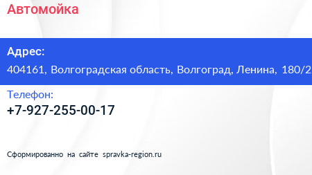 Автомойка по адресу 404161, Волгоградская область, Волгоград, Ленина, 180/2 в дальнейшем Организация, размещена в следующих категориях: