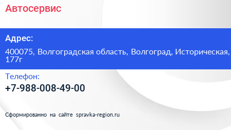 Автосервис по адресу 400075, Волгоградская область, Волгоград, Историческая, 177г в дальнейшем Организация, размещена в следующих категориях: