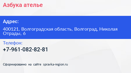 Азбука, ателье по адресу 400121, Волгоградская область, Волгоград, Николая Отрады, 6 в дальнейшем Организация, размещена в следующих категориях: