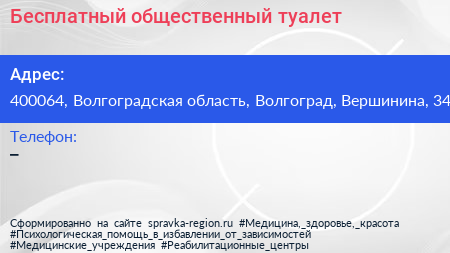 Бесплатный общественный туалет по адресу 400064, Волгоградская область, Волгоград, Вершинина, 34 в дальнейшем Организация, размещена в следующих категориях:
