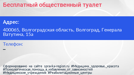 Бесплатный общественный туалет по адресу 400065, Волгоградская область, Волгоград, Генерала Ватутина, 15а в дальнейшем Организация, размещена в следующих категориях:
