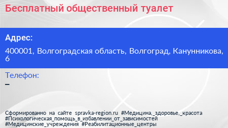 Бесплатный общественный туалет по адресу 400001, Волгоградская область, Волгоград, Канунникова, 6 в дальнейшем Организация, размещена в следующих категориях: