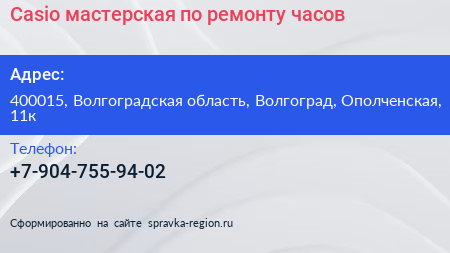 Casio, мастерская по ремонту часов по адресу 400015, Волгоградская область, Волгоград, Ополченская, 11к в дальнейшем Организация, размещена в следующих категориях: