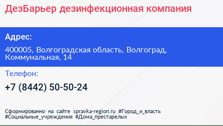 ДезБарьер, дезинфекционная компания по адресу 400005, Волгоградская область, Волгоград, Коммунальная, 14 в дальнейшем Организация, размещена в следующих категориях: