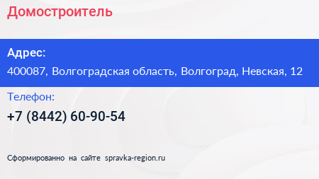 Домостроитель по адресу 400087, Волгоградская область, Волгоград, Невская, 12 в дальнейшем Организация, размещена в следующих категориях: