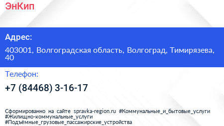 ЭнКип по адресу 403001, Волгоградская область, Волгоград, Тимирязева, 40 в дальнейшем Организация, размещена в следующих категориях: