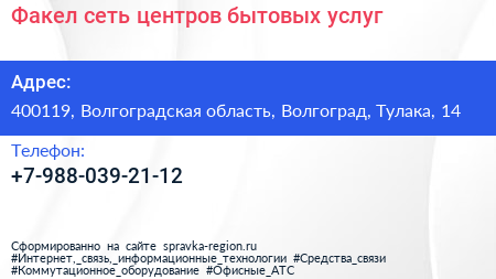 Факел, сеть центров бытовых услуг по адресу 400119, Волгоградская область, Волгоград, Тулака, 14 в дальнейшем Организация, размещена в следующих категориях: