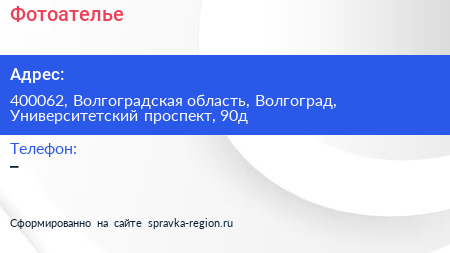 Фотоателье по адресу 400062, Волгоградская область, Волгоград, Университетский проспект, 90д в дальнейшем Организация, размещена в следующих категориях: