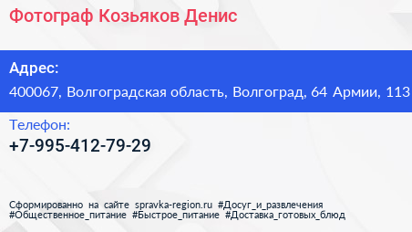 Фотограф Козьяков Денис по адресу 400067, Волгоградская область, Волгоград, 64 Армии, 113 в дальнейшем Организация, размещена в следующих категориях: