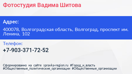 Фотостудия Вадима Шитова по адресу 400078, Волгоградская область, Волгоград, проспект им. Ленина, 102 в дальнейшем Организация, размещена в следующих категориях: