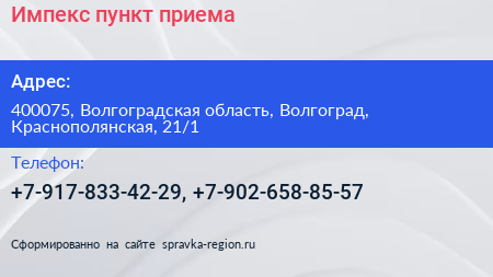 Импекс, пункт приема по адресу 400075, Волгоградская область, Волгоград, Краснополянская, 21/1 в дальнейшем Организация, размещена в следующих категориях: