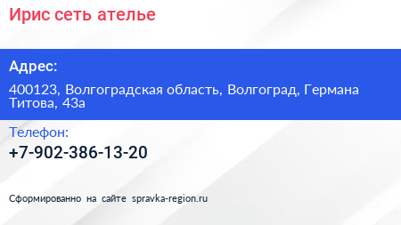 Ирис, сеть ателье по адресу 400123, Волгоградская область, Волгоград, Германа Титова, 43а в дальнейшем Организация, размещена в следующих категориях: