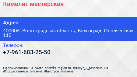 Камелит, мастерская по адресу 400006, Волгоградская область, Волгоград, Ополченская, 11Б в дальнейшем Организация, размещена в следующих категориях: