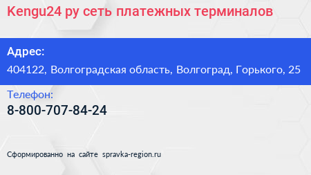 Kengu24.ру, сеть платежных терминалов по адресу 404122, Волгоградская область, Волгоград, Горького, 25 в дальнейшем Организация, размещена в следующих категориях: