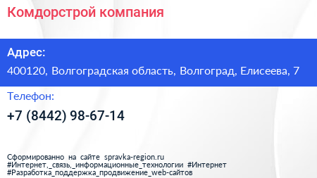 Комдорстрой, компания по адресу 400120, Волгоградская область, Волгоград, Елисеева, 7 в дальнейшем Организация, размещена в следующих категориях: