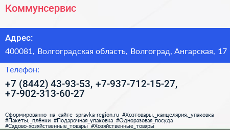 Коммунсервис по адресу 400081, Волгоградская область, Волгоград, Ангарская, 17 в дальнейшем Организация, размещена в следующих категориях: