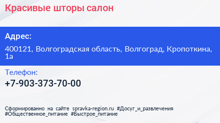 Красивые шторы, салон по адресу 400121, Волгоградская область, Волгоград, Кропоткина, 1а в дальнейшем Организация, размещена в следующих категориях: