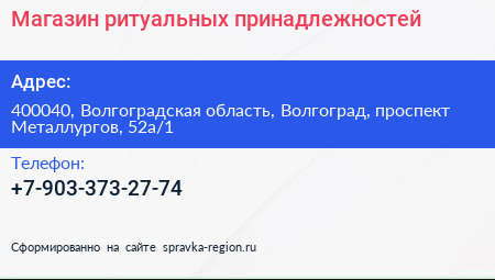 Магазин ритуальных принадлежностей по адресу 400040, Волгоградская область, Волгоград, проспект Металлургов, 52а/1 в дальнейшем Организация, размещена в следующих категориях: