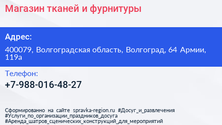 Магазин тканей и фурнитуры по адресу 400079, Волгоградская область, Волгоград, 64 Армии, 119а в дальнейшем Организация, размещена в следующих категориях: