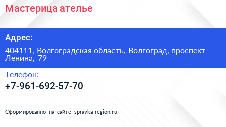 Мастерица, ателье по адресу 404111, Волгоградская область, Волгоград, проспект Ленина, 79 в дальнейшем Организация, размещена в следующих категориях: