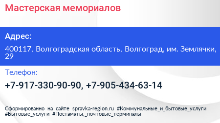 Мастерская мемориалов по адресу 400117, Волгоградская область, Волгоград, им. Землячки, 29 в дальнейшем Организация, размещена в следующих категориях: