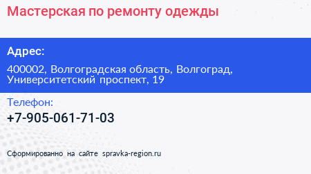 Мастерская по ремонту одежды по адресу 400002, Волгоградская область, Волгоград, Университетский проспект, 19 в дальнейшем Организация, размещена в следующих категориях: