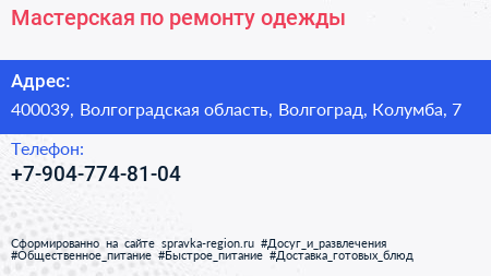 Мастерская по ремонту одежды по адресу 400039, Волгоградская область, Волгоград, Колумба, 7 в дальнейшем Организация, размещена в следующих категориях: