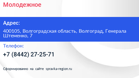 Молодежное по адресу 400105, Волгоградская область, Волгоград, Генерала Штеменко, 7 в дальнейшем Организация, размещена в следующих категориях: