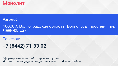 Монолит по адресу 400009, Волгоградская область, Волгоград, проспект им. Ленина, 127 в дальнейшем Организация, размещена в следующих категориях: