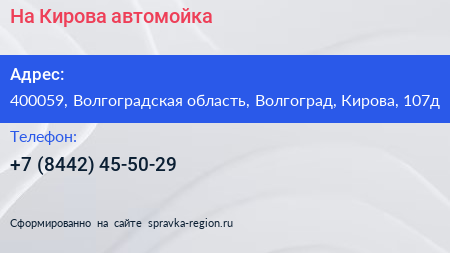 На Кирова, автомойка по адресу 400059, Волгоградская область, Волгоград, Кирова, 107д в дальнейшем Организация, размещена в следующих категориях: